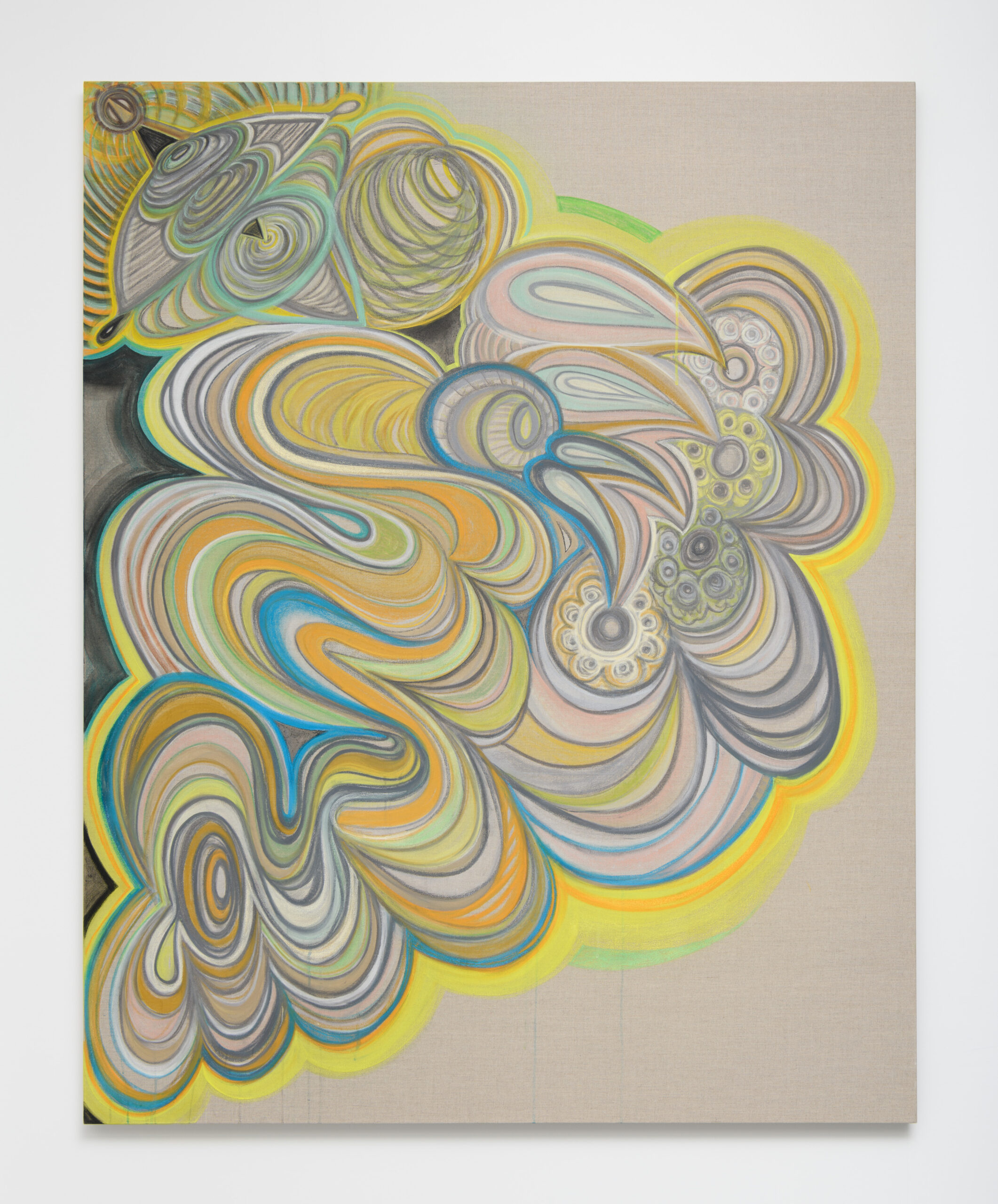 ‘A Talisman Painting’ 2023. Acrylic, pastel, spray paint, West African glass beads and fish vertebrae on linen, 78.5 x 54.5 inches.